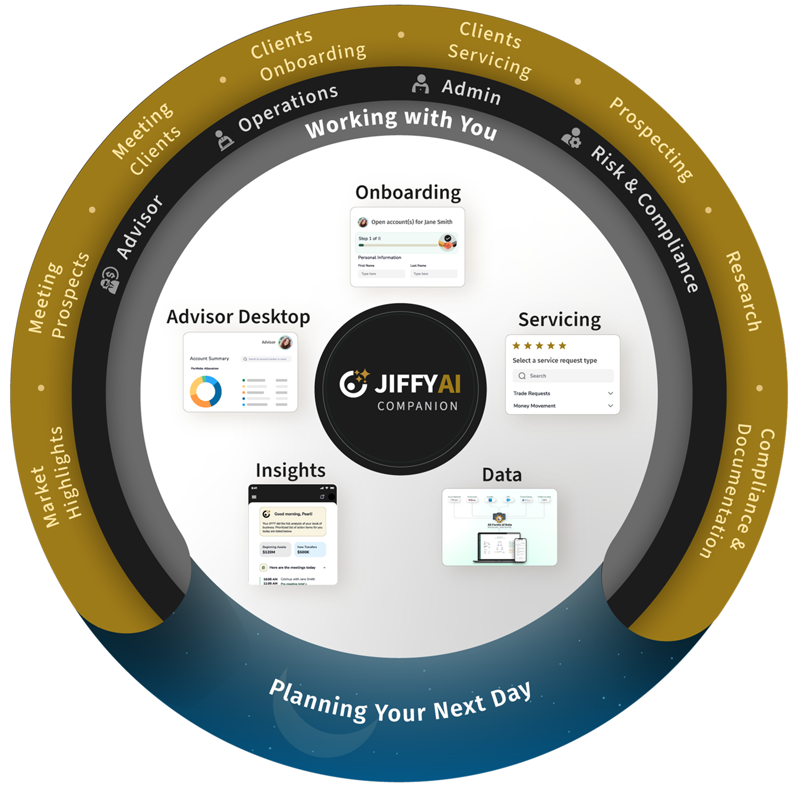 JIFFY.ai offers end-to-end AI solutions for investor onboarding, account servicing, universal advisor desktop and advisor transition, which encompass critical tasks such as product selection, risk profiling, and compliance—tailored for wealth management.