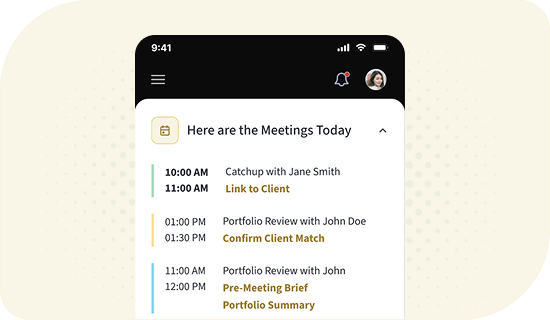 AI-generated briefs with client insights, portfolio updates, and personalized talking points.