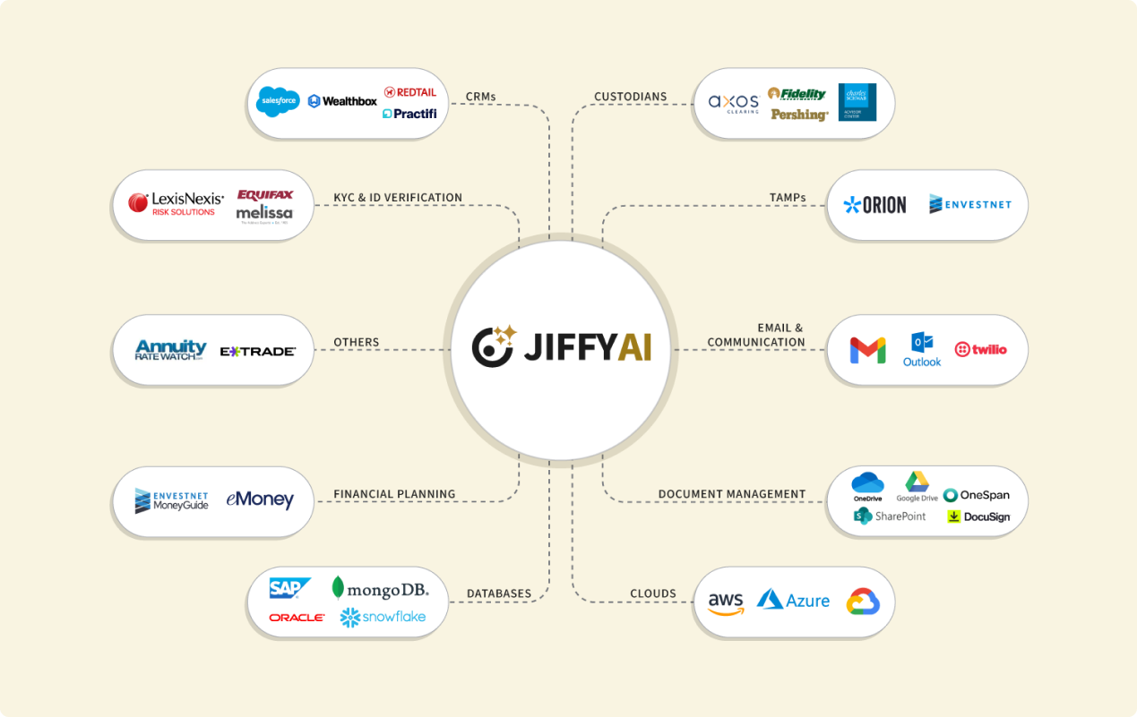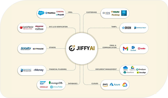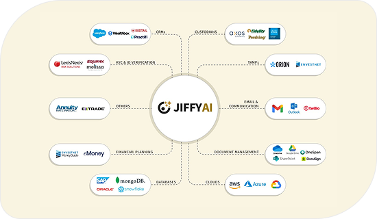 JIFFY.ai is pre-integrated with CRM, banking, mortgage, cards, wealth, loan and treasury systems.