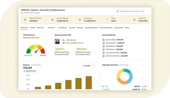 Gain a holistic perspective of client interactions, transactions, and financial health.